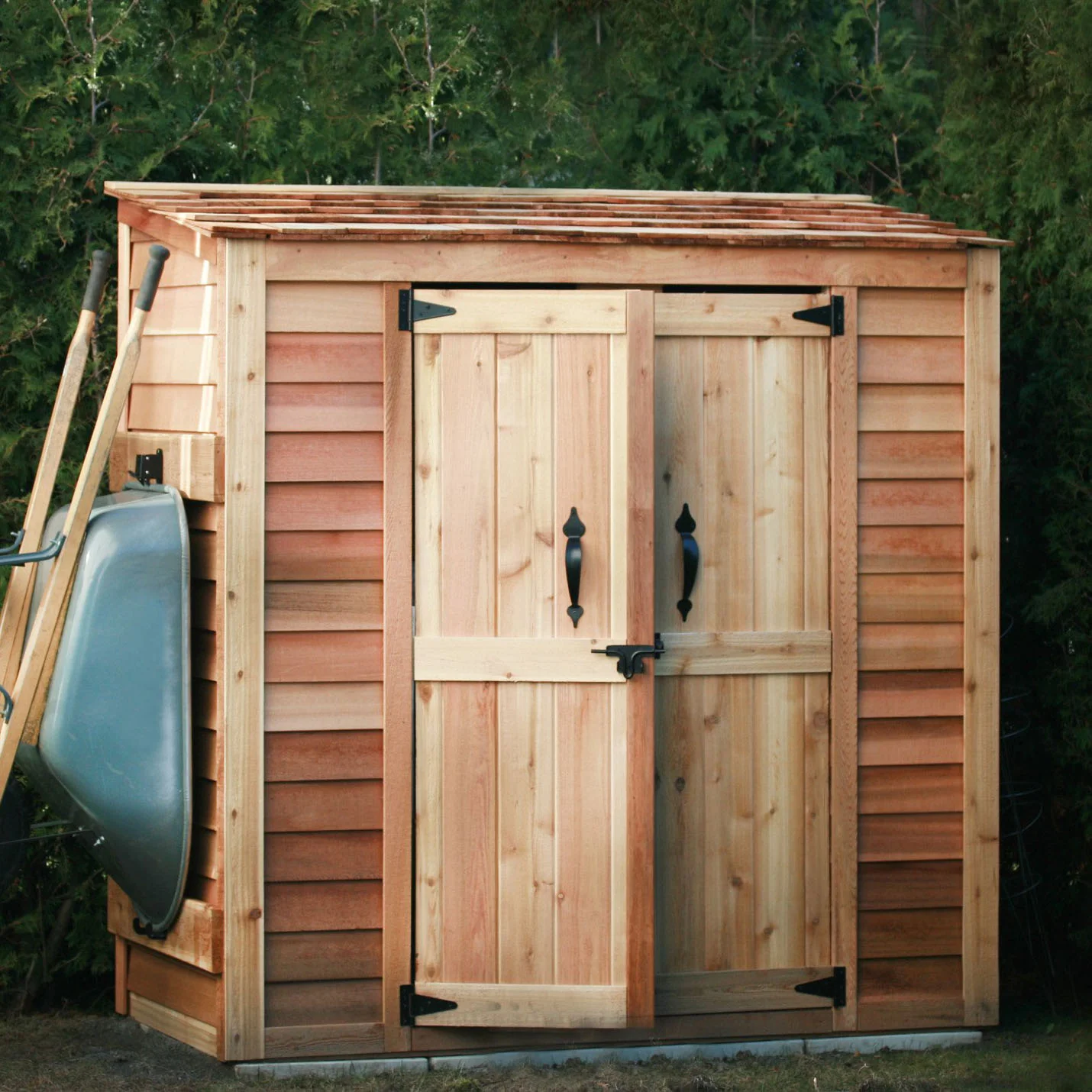 This outdoor cupboard is made with attractive and sturdy panelized wood walls and Western Red Cedar floor, doors, pre-shingled roof, and trim. Made with cedar finger jointed siding.